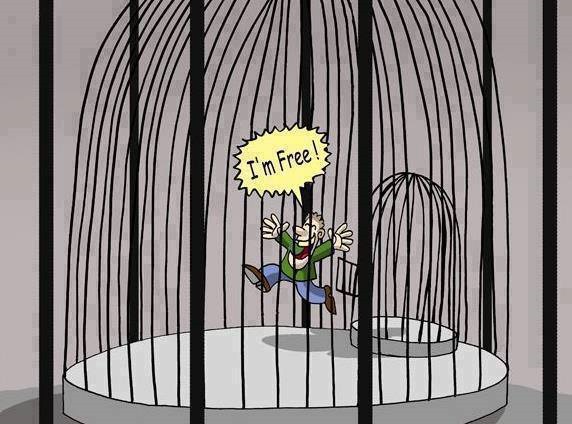 Let’s think. In most of the world escaping into the wild; where only nature would restrict our actions; simply isn’t an option. There isn’t enough wild to escape into, particularly in Europe. So, if we can’t hunt and forage for ourselves, we’re forced to live within those societies and economies which already exist. Within these societies we are forced to go to school throughout our childhood. And within these economies we are forced to either enter the labour market in order to earn enough to survive, or live off the benefits provided by those who feel themselves to be forced into the labour market. Freedom of entry into, and exit out of, the labour market, is not free. Society presents us with commitments that restrict our geographical location, creates expectations that further limit our options in the job market, and creates the economic demand which dictates what careers are going to pay. Flexible and part time roles aren’t allows offered, and thus to take a job we are usually forced to spend most of our time in the job. The competitive economy forces employers to work their employees hard enough that during their free time, many people are too tired to properly look after themselves by exercising or cooking healthy food. In order to stay alive we need a place to live, and to pay bills that often leave us with less than enough cash to freely pursue what we want during that limited amount of free time that we have. We are even imprisoned by society’s desires. Who reading this can’t remember comparing themselves to other classmates at school, and hoping that they would earn more in later life? Those people we call ‘weird’ are in most cases those people who for some reason don’t desire what society encourages us to desire e.g. money.