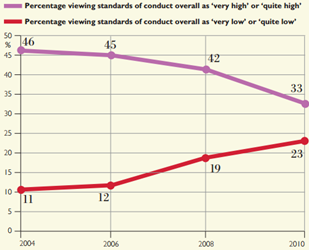 Perceptions about standards of conduct in UK public institutions from 2004 to 2010 have fallen greatly.